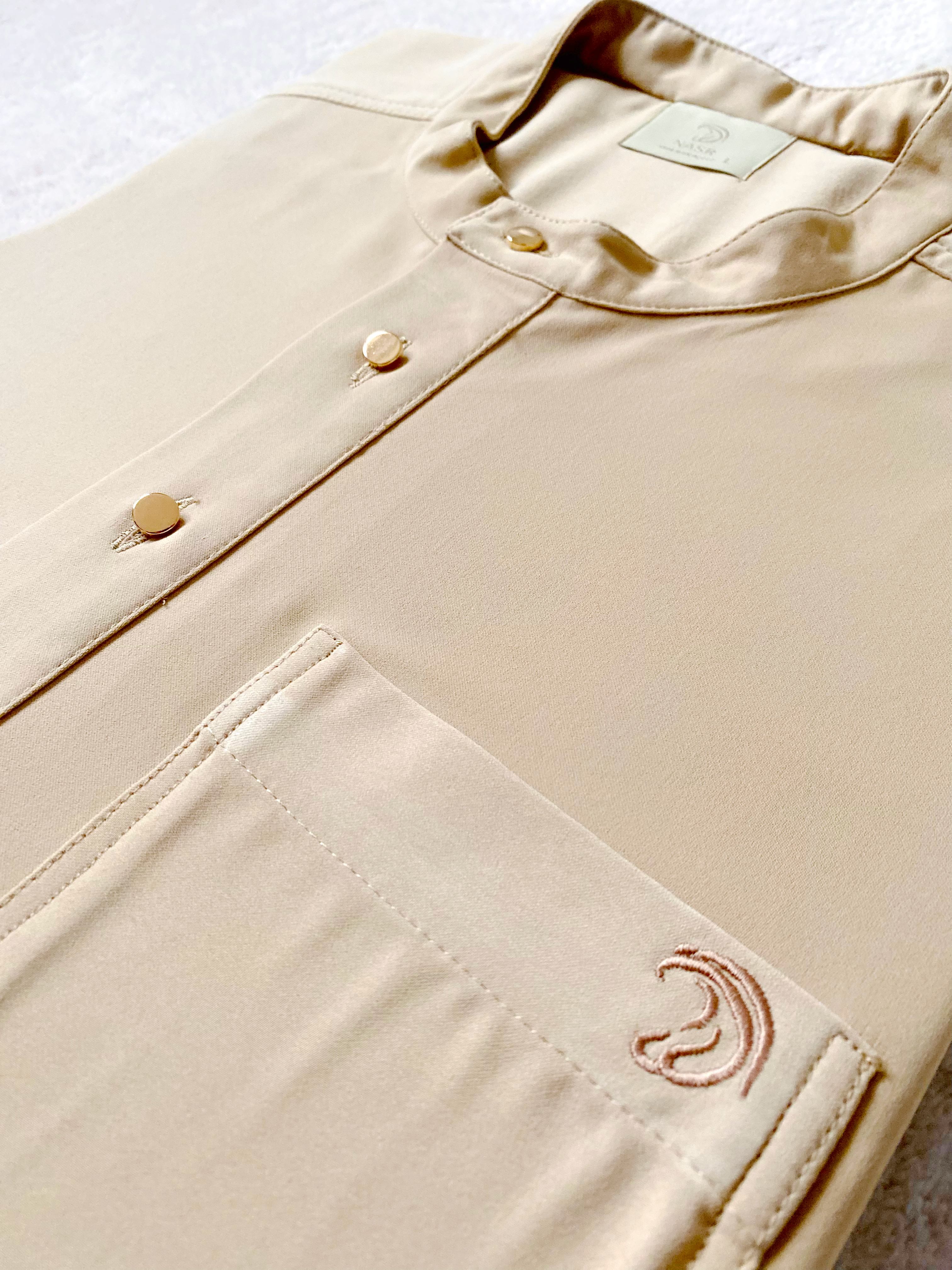 De Qamis is een lange tuniek of mouwloze jurk die vaak wordt gedragen voor religieuze gelegenheden zoals de vrijdaggebeden, ramadan of eid, maar ook dagelijks kan worden gedragen als comfortabele en bescheiden kleding. De Qamis is bekend om zijn moderne, verfijnde uitstraling die perfect past bij de waarden van bescheidenheid en respect voor traditie, terwijl het tegelijkertijd ruimte biedt voor stijl en elegantie.