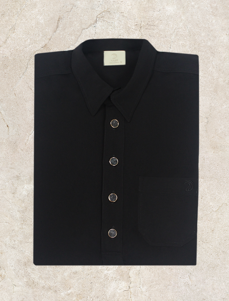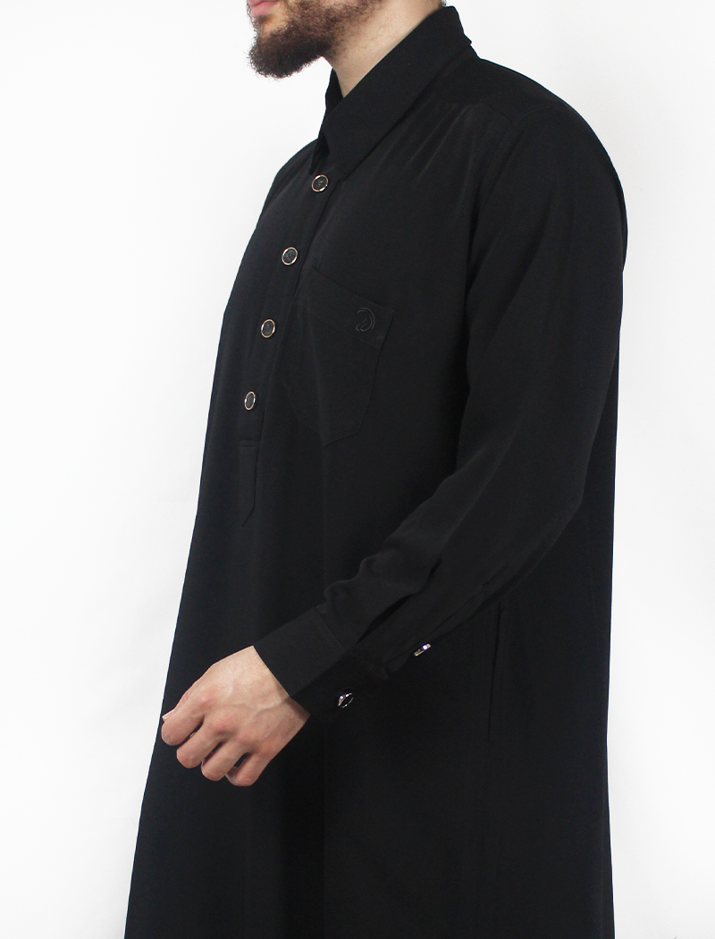 De Adab Khol Qamis straalt tijdloze elegantie uit dankzij de diepe zwarte kleur en de stijlvolle overhemdkraag. Deze combinatie geeft de qamis een moderne en verfijnde uitstraling, perfect voor zowel het gebed als speciale gelegenheden.
