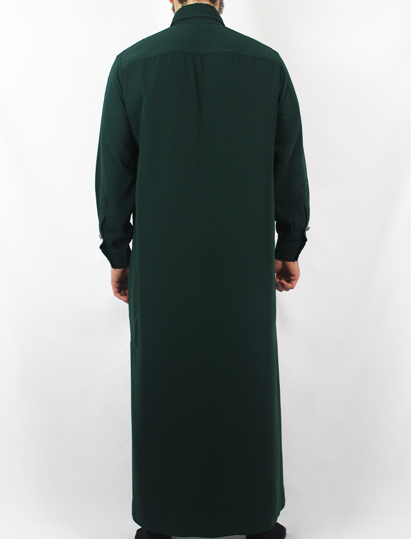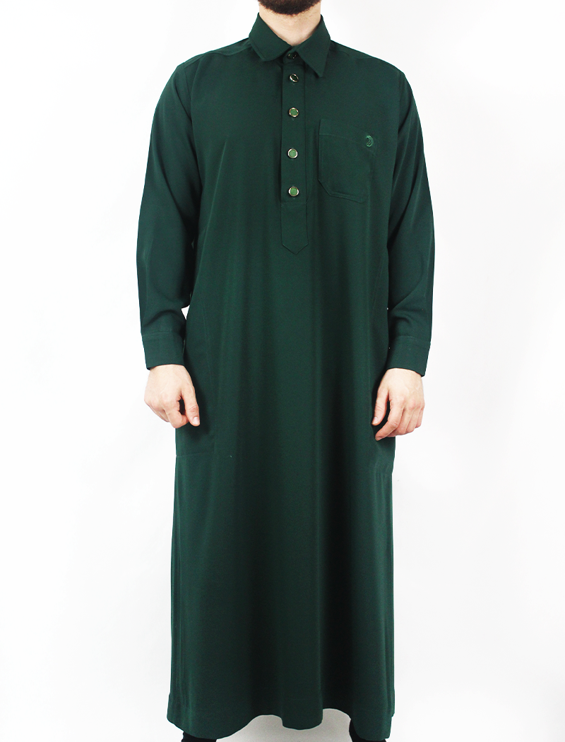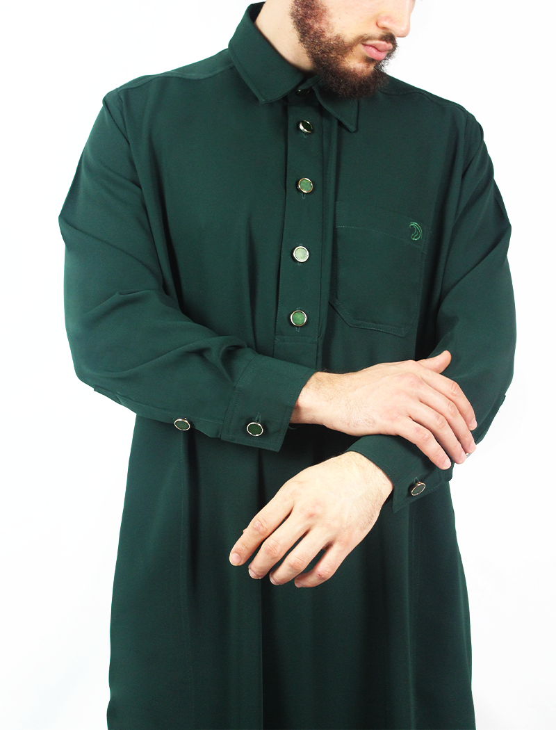 De Adab Deep Forest Qamis combineert traditionele waarden met een eigentijdse uitstraling. De diepe groene kleur en de stijlvolle overhemdkraag geven de qamis een moderne en verfijnde look, perfect voor zowel het gebed als bijzondere gelegenheden.